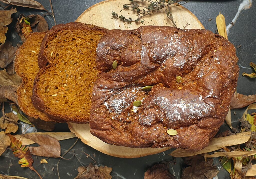 Een experiment dat in een keer lukt, daar word je blij van! Het recept voor dit pompoenbrood vond ik ooit in het blad van Jumbo, en ik heb het brood in plaats van in de oven in de broodbakoven gebakken. Het resultaat: een heerlijk luchtig brood, mooi van kleur door de oranje pompoen en lekker kruidig door de tijm. Ik bakte het pompoenbrood in de Panasonic 2530 op menu 3.